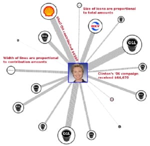 The site is a project of Oil Change International and another collaboration between myself and Greg Michalec. It shows interactive network maps of campaign contributions to presidential races and members of congress. The same data is also shown in drillable tables, so you can go from a politician, to the contributing oil companies, all the way to the image of the original FEC filing. It also permits searching for congress members by name and constituent zip code.