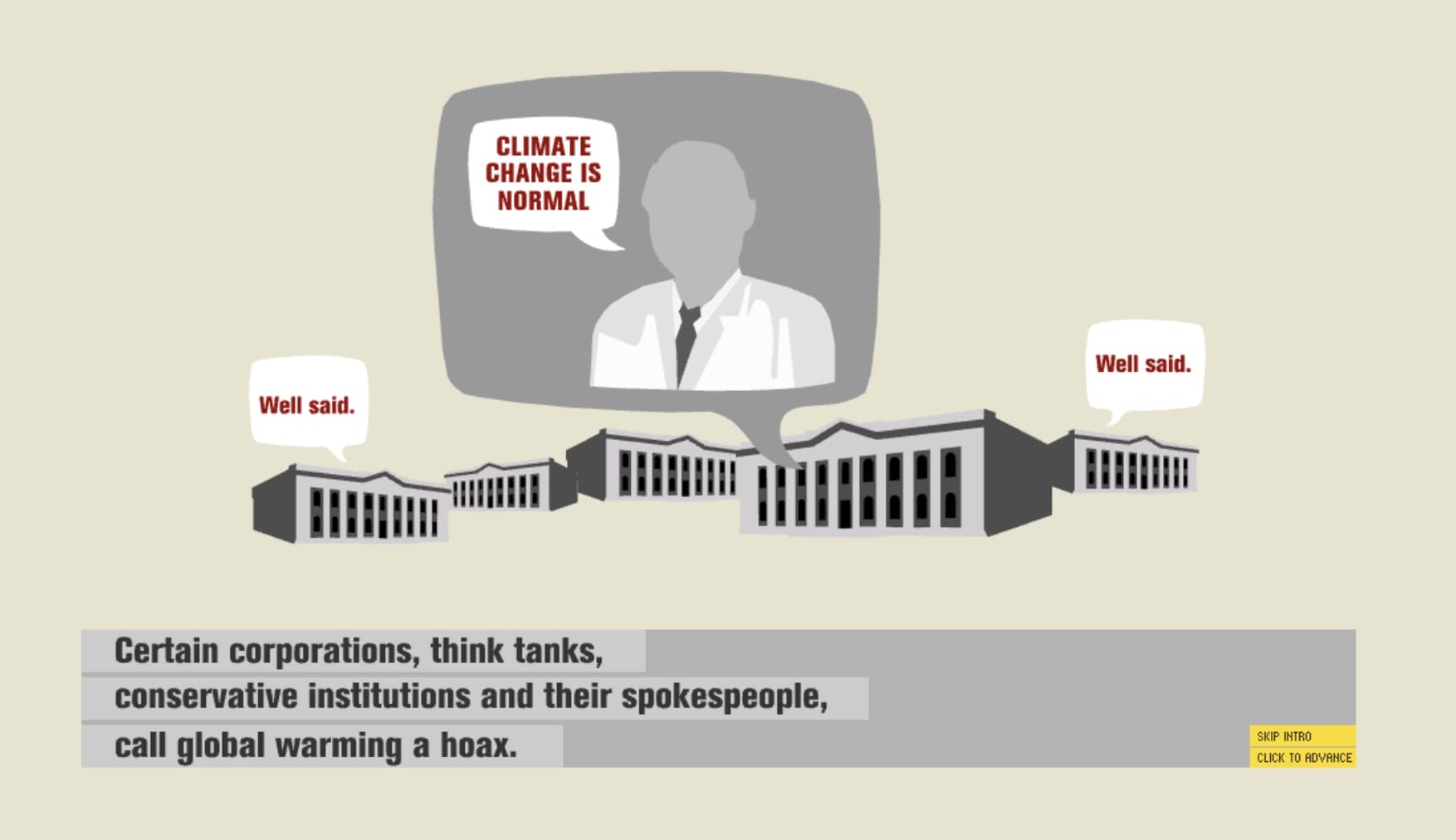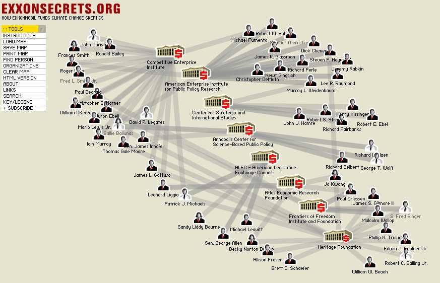 The website visualize the invisible connections between Exxon Mobil and and not-so independent organizations and think-tanks that have worked against solutions to global warming and climate change.