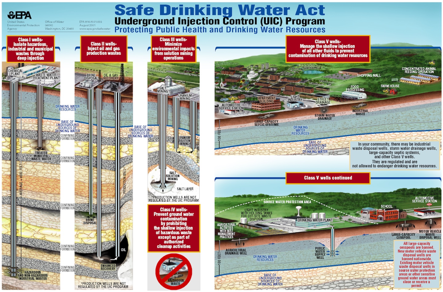 Poster illustrating injection well classes I through V in the U.S. Underground Injection Control program. (Note: Not shown in this poster are Class VI wells, for Geologic Sequestration of CO2, which were authorized by EPA in 2010.)