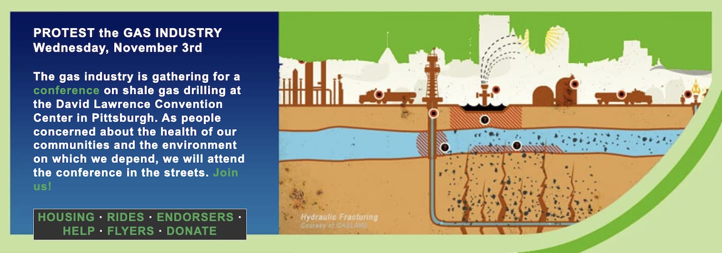 Residents from West Virginia, Western Maryland, New York, and Pennsylvania were joined by activists and artists from all over the country to oppose the dangerous and destructive hydro-fracking gas drilling. The impassioned rally circled David Lawrence Convention Center, where inside gas industry executives were meeting to discuss the “future” of hydro-fracking gas drilling and planning to use heavy explosives to blast apart the Marcellus Shale formation to get the gas beneath.