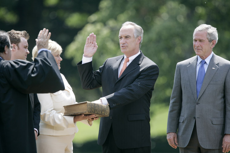Kempthorne is sworn in as Secretary of the Interior on June 7, 2006. On the right: President George W. Bush