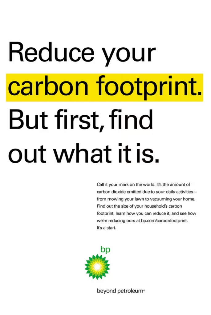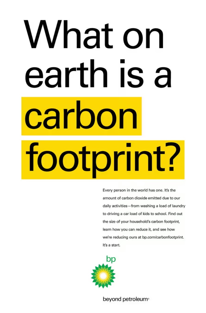 From 2004 to 2006, a $100m-plus a year BP marketing campaign “introduced the idea of a ‘carbon footprint’ before it was a common buzzword”, according to the PR agent in charge of the campaign. The targets of this campaign were the “routine human activities” and “lifestyle choices” of “individuals” and the “average American household”. In 2019, BP ran a new “Know your carbon footprint” campaign on social media.