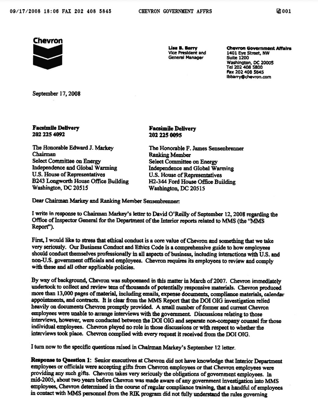 “Sniffing out the bad actors in the Bush administration’s oil division is important, but we need to be just as vigilant with the companies involved in this crude distortion of government ethics,” said Rep. Markey, who chairs the Select Committee on Energy Independence and Global Warming. “It takes two to tango, and the oil companies appear to have danced over just as many ethical lines as the Bush administration officials.”