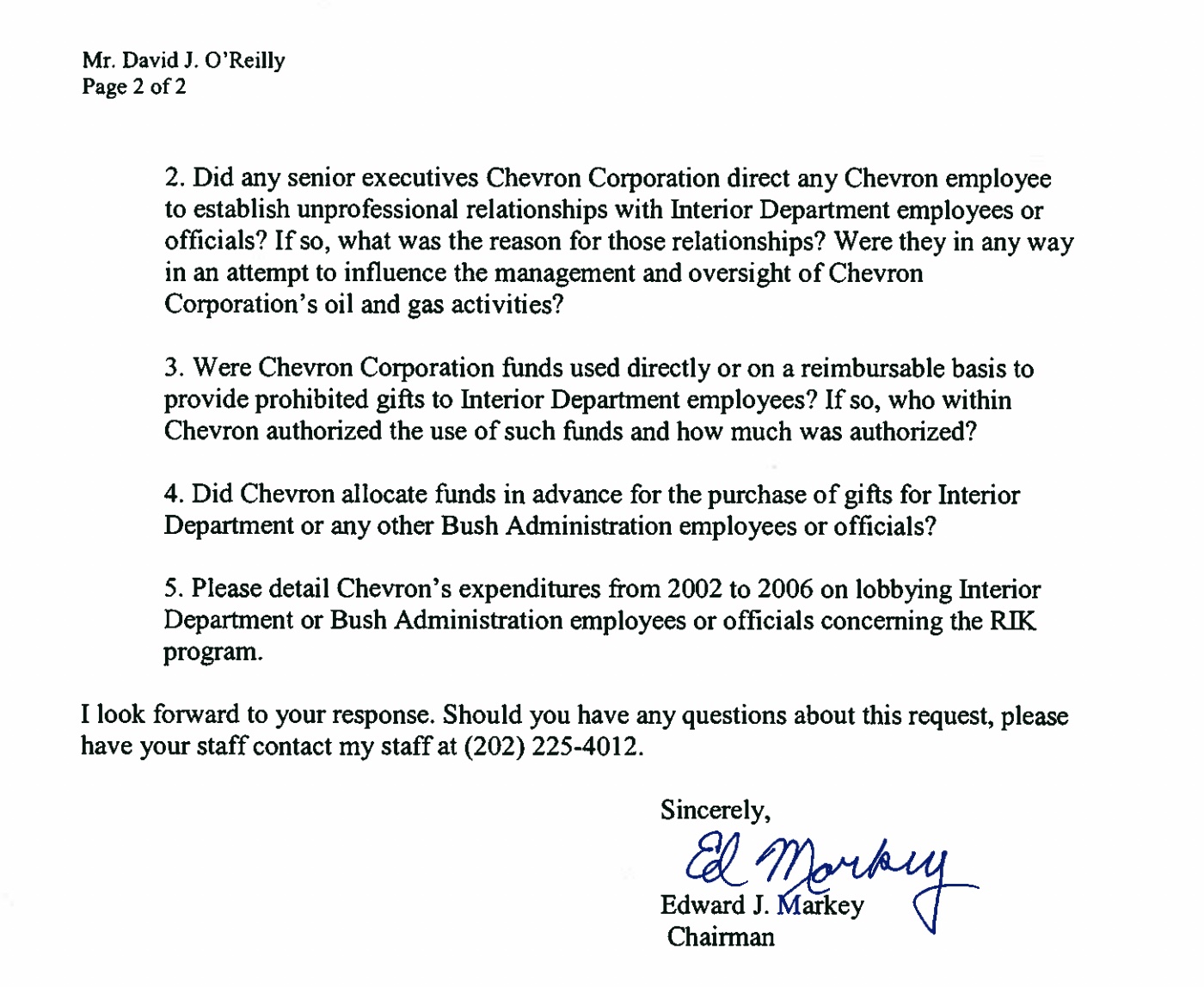Chairman Edward J. Markey has launched an investigation into the growing scandal involving members of the Bush administration’s Interior Department oil division. Chairman Markey sent letters late Friday to the heads of the oil companies involved in the scandal, probing the companies’ knowledge of the unethical dealings between oil company officials and the regulators.