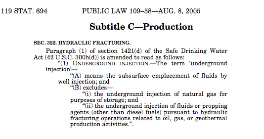 Section 322 of this Law amended the Safe Drinking Water Act (SDWA) to exempt all fracturing fluids except diesel from EPA regulations.